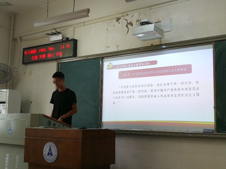 2020年9月17日星期四下午14点,信息与安全工程学院本科生第一党支部在文澜303教室召开了以“贯彻落实好新时代党的组织路线,奋力谱写“双一流”建设新篇章”为主题的党日活动。