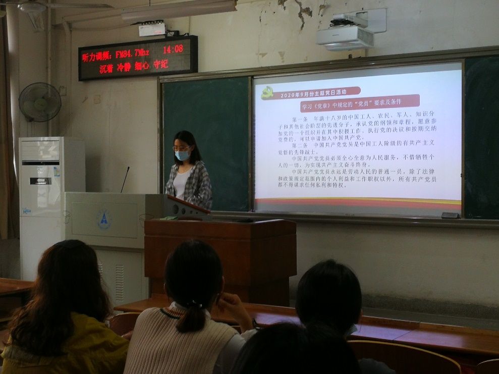 苑心怡同志带领大家诵读了党章中规定的“党员”要求及条件,加深了同学们对党的章程的了解,对党的目标的理解。