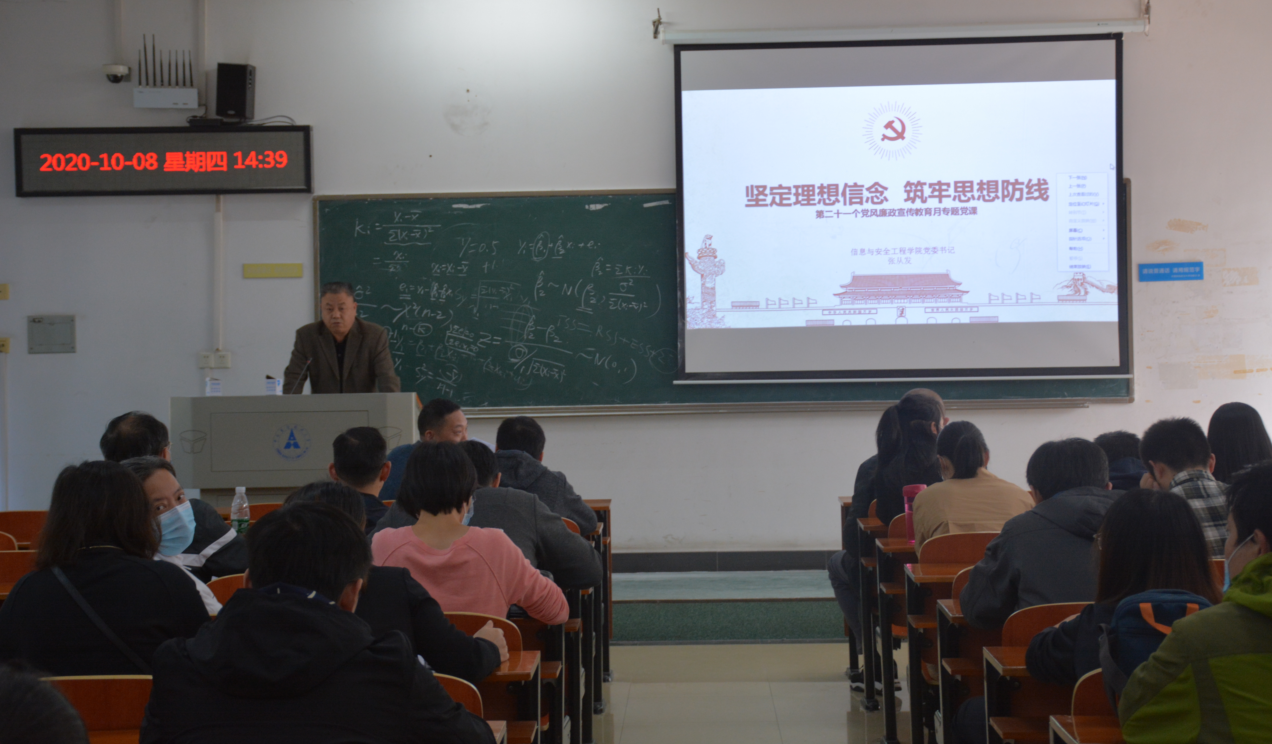 (通讯员:杨晨)2020年10月8日下午2:30,信息与安全工程学院于文波楼207召开党员教职工党风廉政建设宣传教育大会,会议由院党委委员、副书记刘永新主持,全体党员教职工参加本次会议。