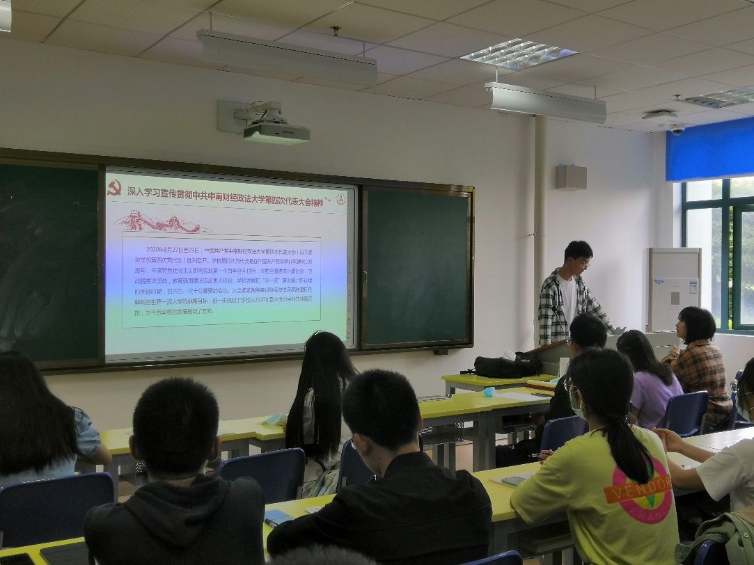 会议第三项,深入学习宣传贯彻学校第四次党代会精神。党代会以高举中国特色社会主义伟大旗帜,以习近平新时代中国特色社会主义思想为指引,深入贯彻落实党的十九大和全国高校思想政治工作会议、全国教育大会精神,坚持和加强党的全面领导,坚持社会主义办学方向,不忘初心、牢记使命,全面落实立德树人根本任务,大力推进学校高质量发展,奋力谱写财经政法深度融通特色鲜明的世界一流大学建设新篇章,为加快推进建设教育强国、实现“两个一百年”奋斗目标和中华民族伟大复兴的中国梦贡献中南力量为主题,强调未来五年,是学校发展的战略机遇期,要面向推进教育现代化、建设教育强国的宏伟蓝图,始终牢记新时代使命,全面推进高质量发展,以决胜的姿态向建设“一流学科”迈大步,以坚定的信心为建设“一流大学”打基础,全力推进新时代学校党建工作的部署要求,并做好党风廉政和反腐败工作。党代会精神的学习,使学生党员们立足于新时期学校发展的新蓝图,并为学生党员们的未来发展指明了方向,切实增强学生们学习工作的科学性、预见性、主动性和创造性,更鼓舞人心、催人奋进。