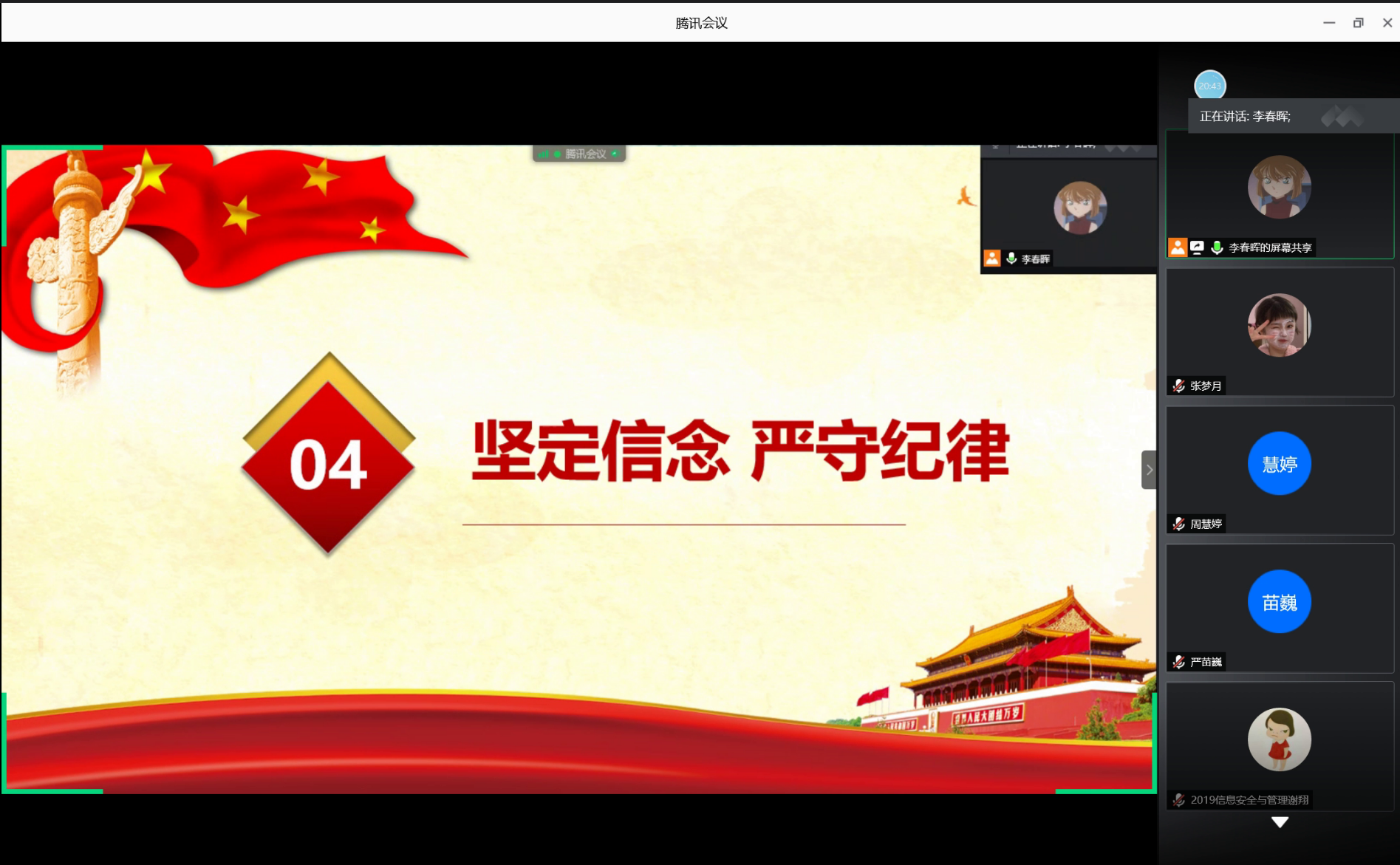 (通讯员:李必成 张梦月)2021年4月22日晚七点,信息与安全工程学院研究生党支部开展了“学史增信跟党走,百年荣光耀初心”支部主题党日活动。本次主题党日活动在腾讯会议上开展,会议由研究生党支部纪检委员李春晖同志主持,研究生辅导员、研究生党支部书记李必成老师以及全体党员同志参加了本次会议。