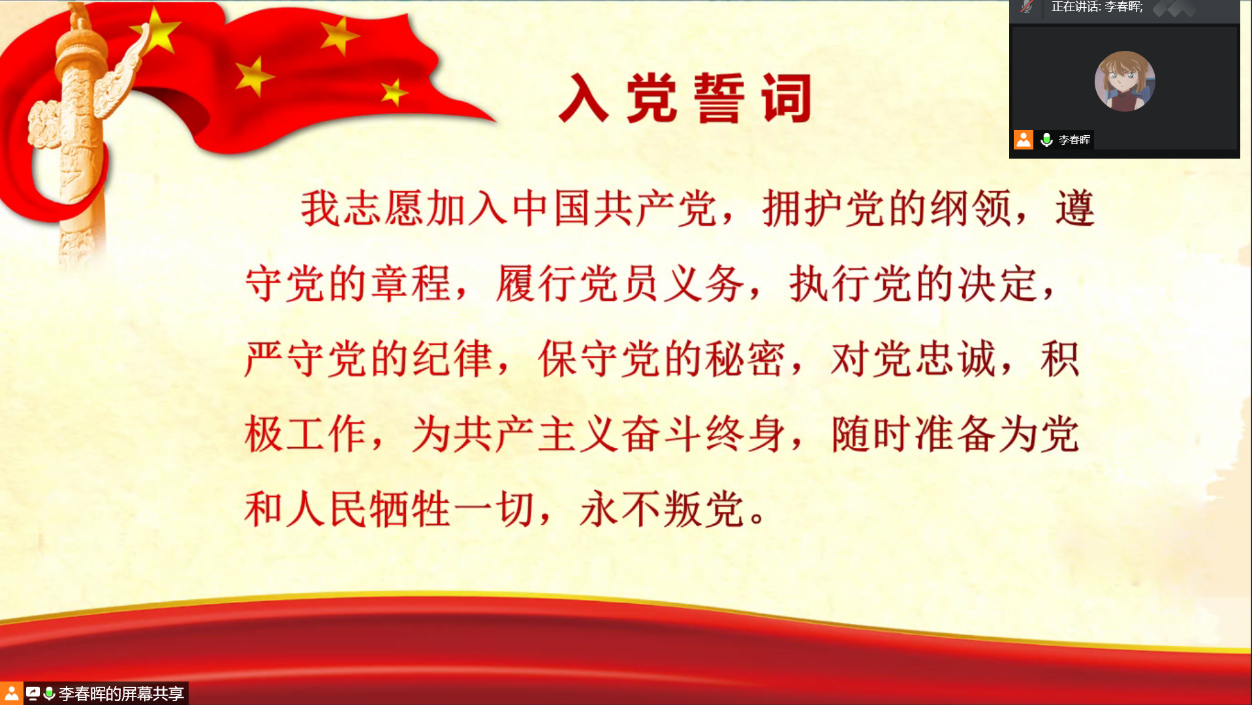 会议伊始,全体党员重温入党誓词。虽然是线上会议,各位党员仍在李春晖同志的带领下庄严宣誓。宣誓是一种形式,更是一种激励,一种鞭策,一种对信仰的强化,它带给我们的震撼已远远超过誓词本身。重温入党誓词,可以让大家在宣誓过程中体会身为一名共产党员的光荣使命,对照入党誓词中的要求找差距,反思自身存在的问题并努力改正,发挥好党员的先锋模范作用。