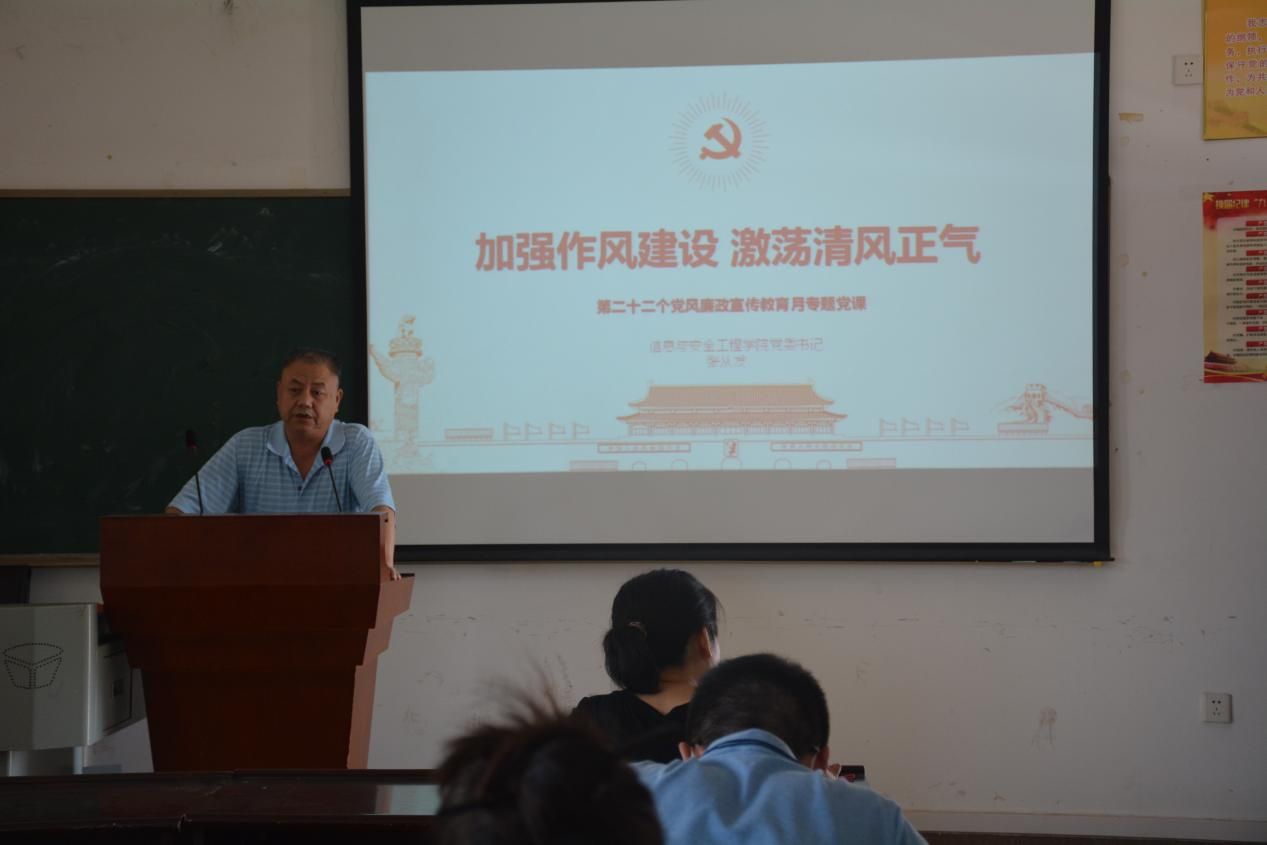 (通讯员:杨晨)2021年9月23日下午2:30,信息与安全工程学院于文永楼502会议室召开党员教职工党风廉政建设宣传教育大会,会议由院党委委员、副院长熊平主持,全体党员教职工参加本次会议。