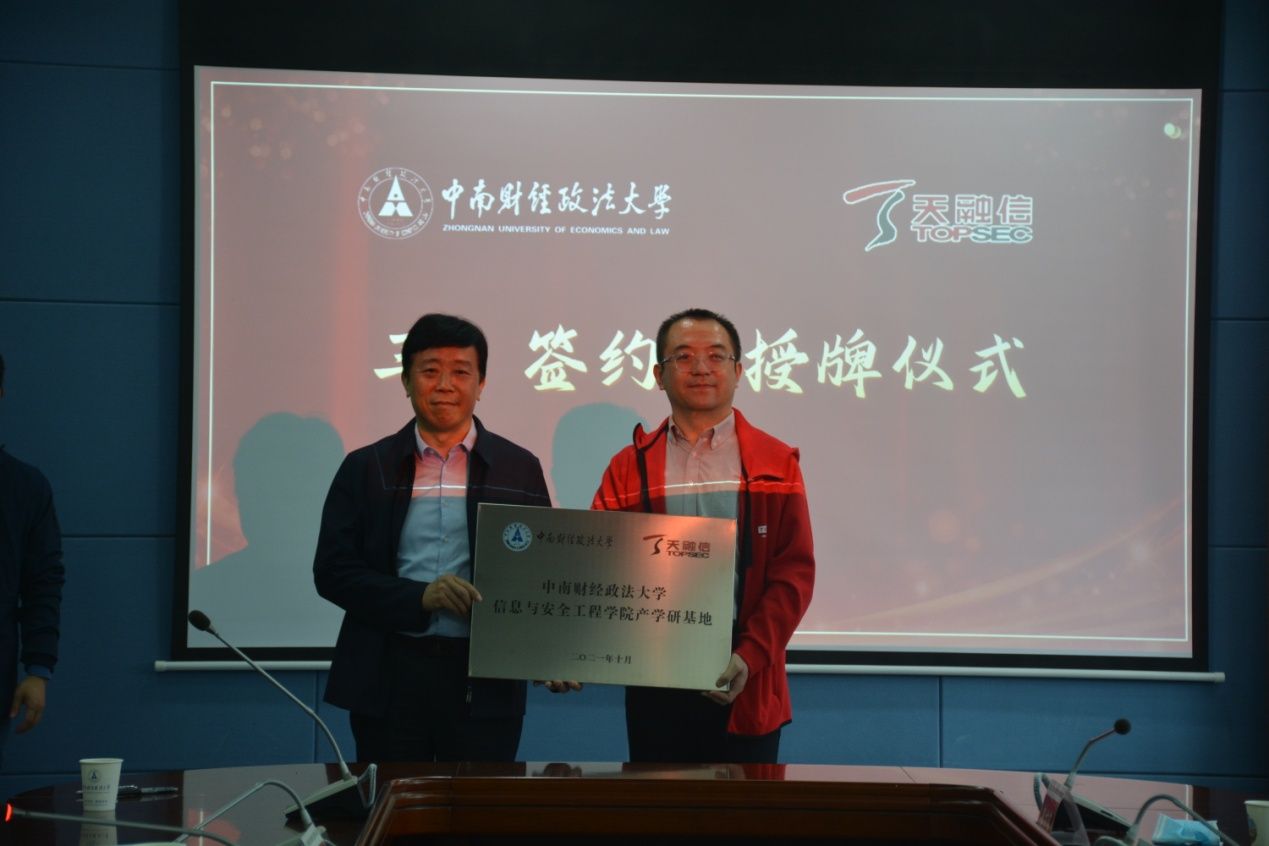 申祖武副校长向北京天融信科技集团授予“米兰电竞·(中国区)信息与安全工程学院产学研基地”牌匾