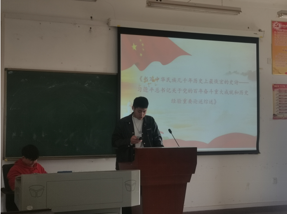 最后,环境1801班关劲锋同志带领大家学习文件《习近平总书记关于党的百年奋斗重大成就和历史经验重要论述综述》。表明在未来我们将继续坚持在以习近平同志为核心的党中央的领导,全面贯彻习近平新时代中国特色社会主义思想,大力弘扬伟大建党精神,以史为鉴、开创未来,埋头苦干、勇毅前行,为实现第二个百年奋斗目标、实现中华民族伟大复兴的中国梦而不懈奋斗。