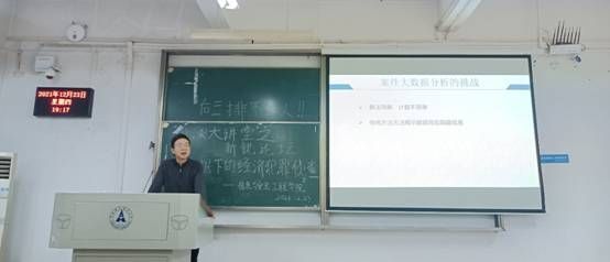 随后讲座正式开始。屈振新副教授首先展示了利用大数据办案的成果,其带领的大数据算法团队协助湖北省公安厅经侦总队在公安部大比武中获得财税领域全国一等奖。