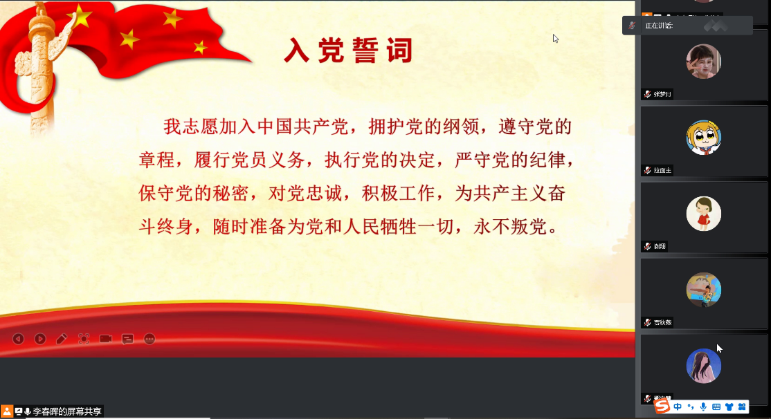 会议伊始,全体党员重温入党誓词。虽然是线上会议,各位党员仍在李春晖同志的带领下庄严宣誓。宣誓结束后,党员同志集中学习“习近平在中央党校(国家行政学院)中青年干部培训班开班式上发表的重要讲话”。习近平总书记强调,年轻干部是党和国家事业发展的希望,必须筑牢理想信念根基,守住拒腐防变防线,树立和践行正确政绩观,练就过硬本领,发扬担当和斗争精神,贯彻党的群众路线,锤炼对党忠诚的政治品格,树立不负人民的家国情怀,追求高尚纯粹的思想境界,为党和人民事业拼搏奉献,在新时代新征程上留下无悔的奋斗足迹。