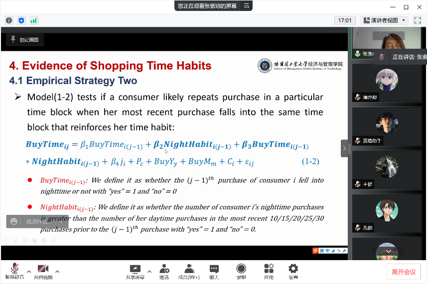 (通讯员:周格格)2022年4月22日上午10:00,哈尔滨工业大学经济与管理学院教授、博士生导师张紫琼教授应邀来我院开展题为“顾客在线购物时间习惯及其影响的实证研究:早起的鸟儿和晚来的猫头鹰”线上讲座。讲座由院长金大卫教授主持,信息与安全工程学院全体研究生参加了本次讲座。杨俊副院长、信息系主任刘雅琦老师等教师代表参加了讲座。