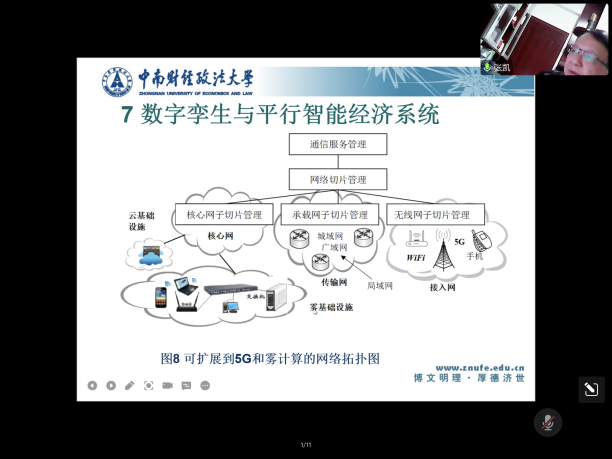 接着,张凯教授对算法经济学研究手段的发展趋势进行总结,重点介绍了数字孪生与平行智能经济系统的构建过程,并对元宇宙的本质、应用技术以及研究现状进行了分析。元宇宙本质上是对现实世界的虚拟化、数字化的过程,需要对内容生产、经济系统、用户体验以及实体世界内容等进行大量改造。这一部分张凯教授也向同学们介绍了人工生命、人工社会、边缘计算、雾计算等热点词汇的概念。