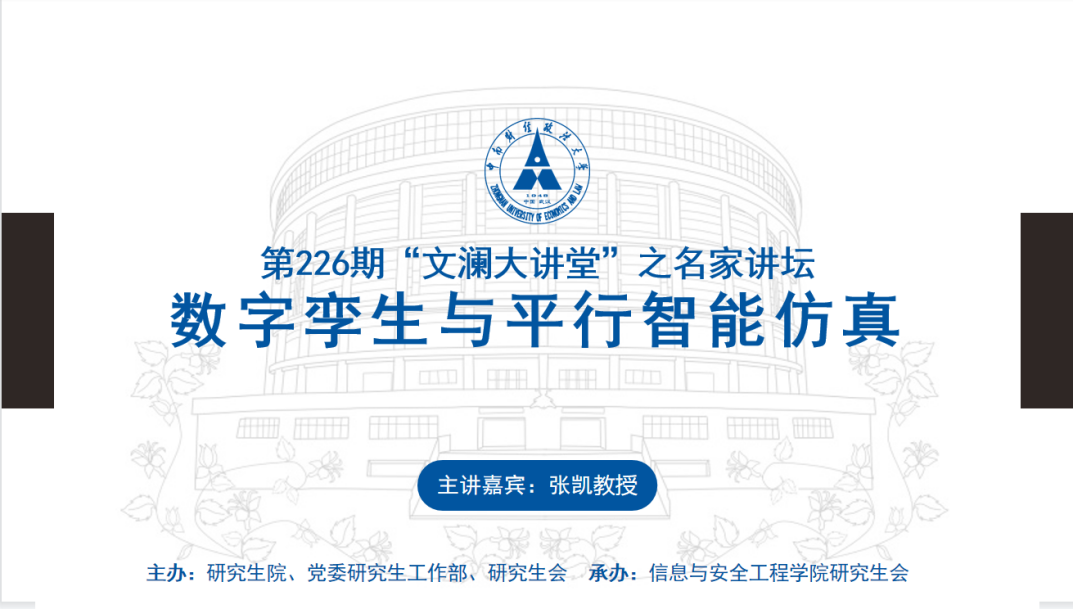 本次讲座聚焦于广大学子关心的热点话题,结合当下的时事热点与学术的前沿动态,邀请我院张凯教授作为主讲嘉宾,向信息与安全工程学院全体研究生宣讲数字孪生与平行智能仿真。讲座伊始,主持人对此次活动的背景、目的及主讲嘉宾进行介绍。