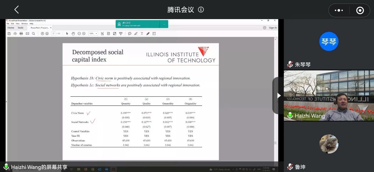 王海之教授的讲座分享分为理论介绍和实证研究两个部分。首先,他从发明,创新,模仿三者的区别入手,说明创新与创业之间的联系,介绍了整个创业活动的流程;其次,王教授主要是以社会资源对企业的影响为实证,借助于社会网络等指标建立回归方程,度量各因素对区域创新的影响。最后,王教授提出,社会资本对私有企业创新有正向影响,私有企业创新具有集聚性。