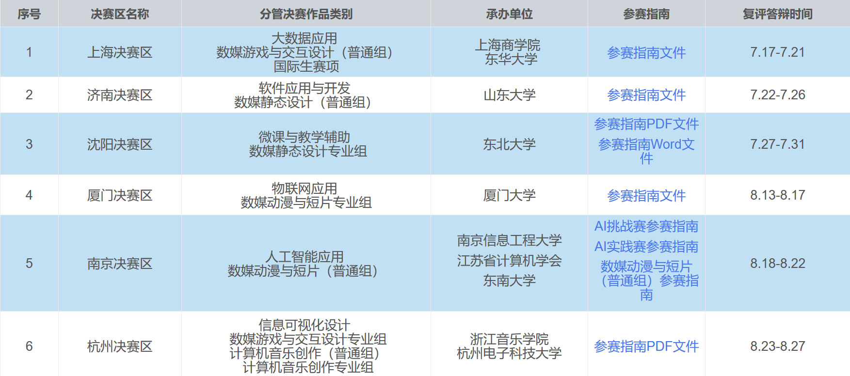 2022年(第15届)中国大学生计算机设计大赛国赛决赛在6个不同赛区举行(详见https://www.jsjds.com.cn/Index/article/view-national-article?id=986866及图1),分为初评和复评两个阶段,初评为线上评审,时间为6月中下旬,初评推荐进入复评的作品名单将于6月底在大赛官网公示;复评采取线上答辩方式,时间为7月- 8月。希望入围国赛的同学提前做好准备,再接再厉,取得更好的成绩。