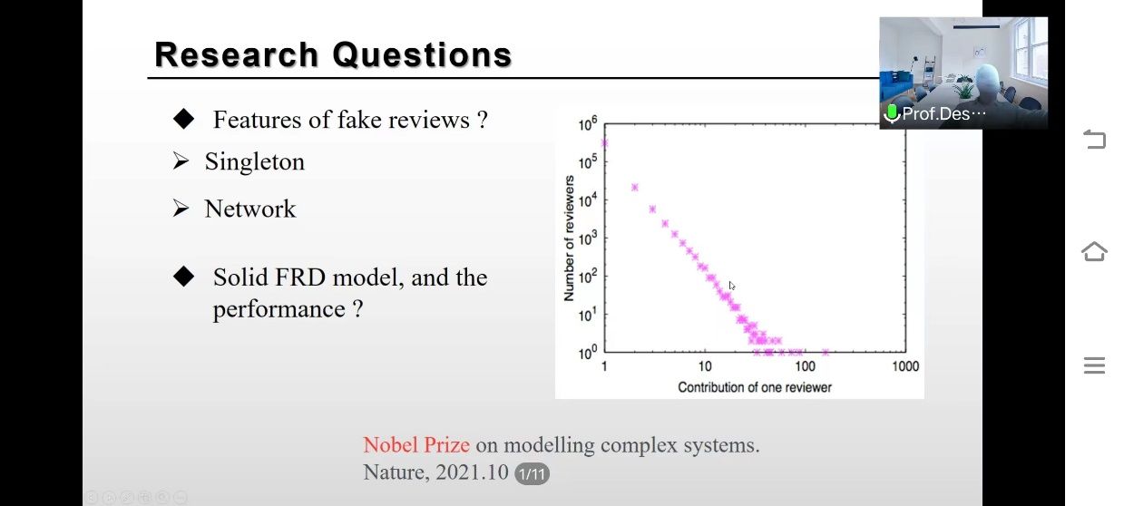 其次,吴德胜教授向我们展示了他的研究方法和研究步骤。首先,通过文献研究和问卷调查对虚假评论进行简要分析。然后,结合该分析结果和相关理论成果进行建模。在讲座中,吴德胜教授向我们详细讲解了监测模型的整个运行流程,以及三种挑选虚假评论的排名方法,并结合一个实验案例让我们更好地理解整个原理过程。