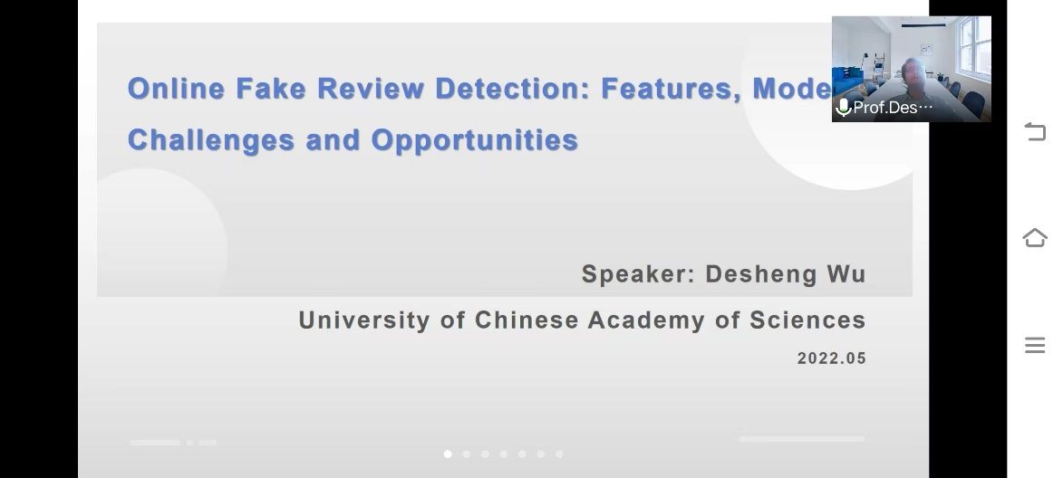 (通讯员:李必成 黄婷 聂灵)2022年5月30日下午14时,中国科学院大学吴德胜教授应邀出席信息与安全工程学院“工程学术论坛”,为我院研究生学子开展题为“Online Fake Review Detection: Features, Modeling, Challenges and Opportunities”的线上讲座。信息与安全工程学院院长金大卫教授主持讲座,安全科学与工程系副系主任刘嘉等教师代表以及信息与安全工程学院全体研究生参加本次讲座。