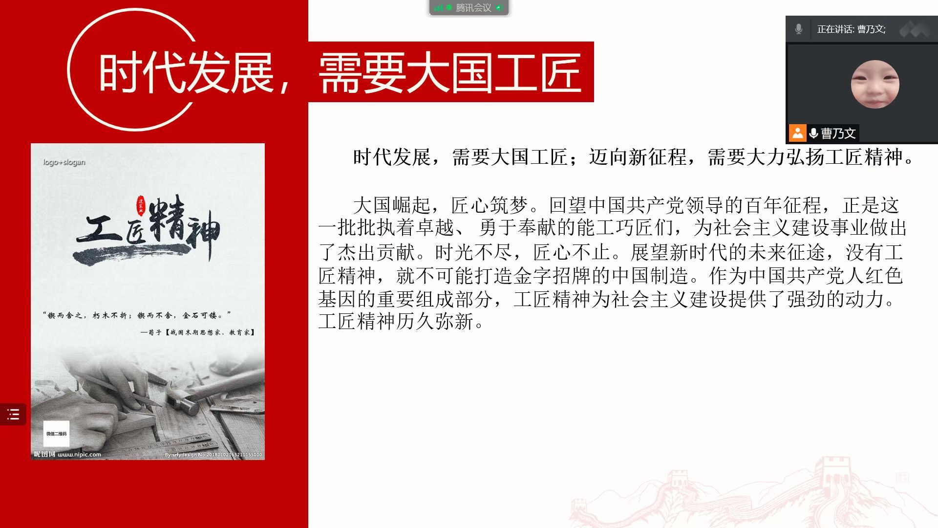 本期党课的主旨是,工匠精神首先是一种劳动精神。人民创造历史从根本上看是劳动创造历史。人类在改造自然的伟大斗争中,不断认识自然的客观规律,通过在劳动实践中不断积累实践经验与技能,从而推动历史进步和创造更为丰富的社会财富。中国梦的实现,人民群众美好生活需要的满足,都需要广大劳动人民的劳动创造。工匠精神是对职业劳动的奉献精神。几千年来从事技艺劳动的各种工匠,其社会地位并不高,然而,千百年来工匠以业维生,并以技艺为立身之本,无私地奉献自己的全部心血,提高和完善自己的技艺,创造了灿烂的工匠文化。工匠精神就是干一行爱一行,在干中增长技艺与才能。发扬工匠精神,就要提高我们的爱岗敬业精神,正如习近平总书记所说:“劳动没有高低贵贱之分,任何一份职业都很光荣。”劳动最崇高,劳动最光荣,在平凡的岗位干出不平凡的业绩,就是工匠精神的体现。无论是三峡大坝、高铁动车,还是航天飞船,都凝结着现代工匠的心血和智慧。