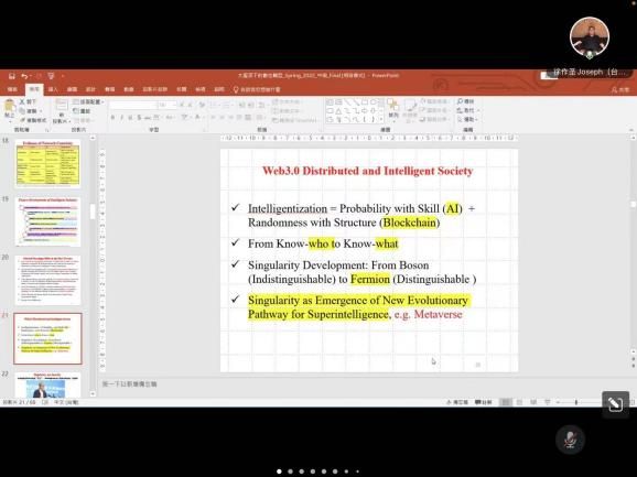 然后,徐教授向与会人员介绍了AI、区块链技术和web3.0智能分布式网络系统。徐教授还就智能产业的未来发展、奇点与未来等问题作了深刻讲解,教授指出:①高科技产业发展现阶段的重点是软硬融合;②系统性的思维加上奇点优势的营造是未来关注的焦点。