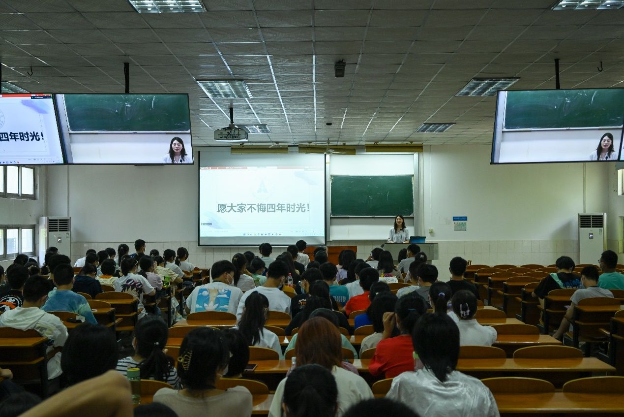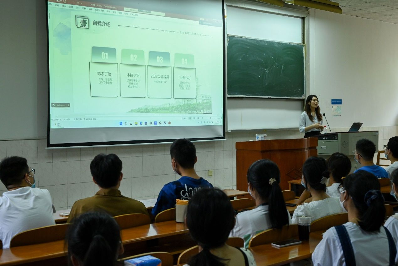 首先,陈孝丁敬老师以漫画的形式向新生介绍了大学辅导员的工作日常,并表示在未来四年会陪伴和帮助大家的学习和生活。陈孝丁敬老师还用了四组数据展示了22级本科新生具有的优势,也提醒大家大学四年里也要继续加油成为更好的自己。陈孝丁敬老师鼓励大家在大学这座象牙塔里多多尝试,努力成长,并提出了希望和要求。