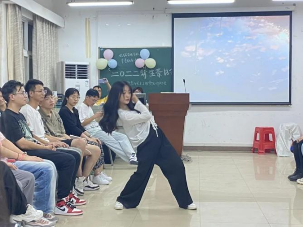 “今晚,来自五湖四海的各位同学欢聚一堂,为我们即将开启的、充满希望的研究生生活而欢庆……”在主持人胡静宜和宿家杰慷慨激昂的开场词中,2022级新生茶话会正式拉开帷幕。茶话会由研究生会各部门代表带来的舞蹈《爱你》开场,迅速调动起了现场的气氛。接着,由陈硕同学带来舞蹈《90’s Love》,陈硕同学的舞蹈充满力量感和节奏感,现场掌声尖叫声不断。随后,来自工程管科的胡宇波同学与来自金融学院的娄睿杰同学合作演唱歌曲《别怕变老》,将现场气氛又推向了一个新的小高潮。