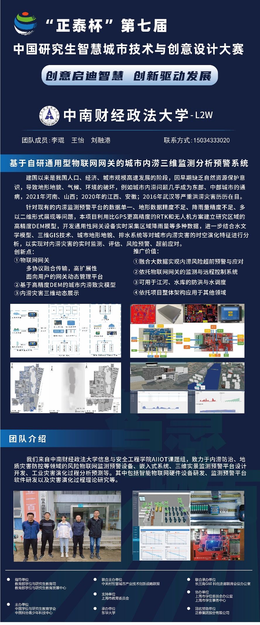 信息与安全工程学院研究生李琨、王怡、刘融港将AIIoT课题组在物联网监测装备、物联网监测系统集成、三维GIS预警系统等领域的技术成果,应用于三维城市内涝灾害的监测预警。其作品《基于自研通用型物联网网关的城市内涝三维监测分析预警系统》,在历时一年多的比赛层层选拔中脱颖而出,在决赛阶段荣获二等奖。