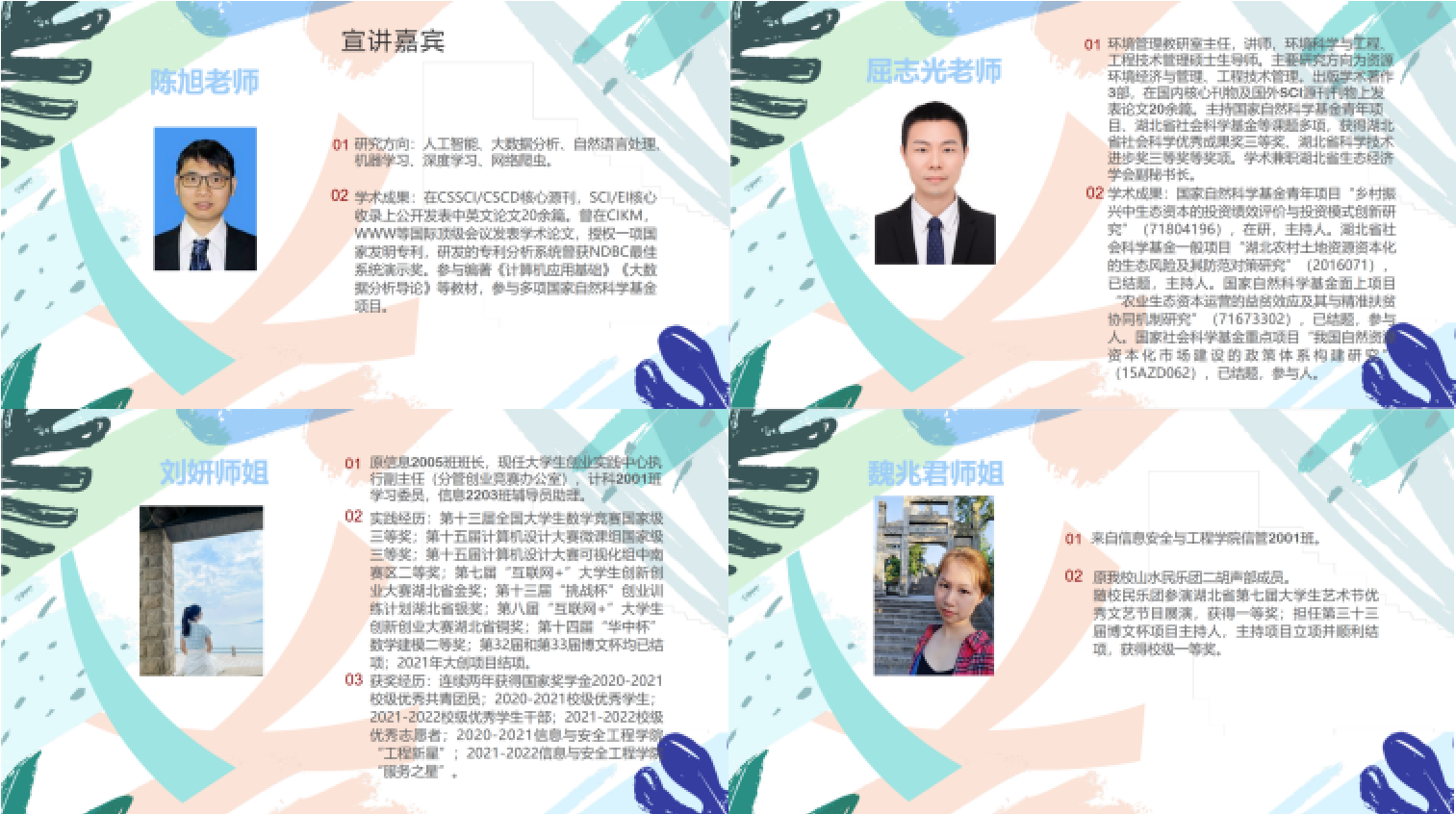 (学生记者 黄憬)11月5日晚6点30分,信息与安全工程学院于线上举办了博文大创经验交流会,参会的嘉宾有环境管理教研室主任屈志光老师、信息管理专业陈旭老师、计科2001班刘妍同学和信管2001班魏兆君同学。