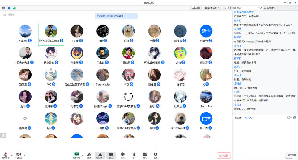 在最后的交流与提问环节,同学们积极地与老师和师姐进行互动。同学们根据自己的对博文杯、大创等内容的了解,就选题、立项、比赛前的准备等提出自己的疑问,老师和师姐们也耐心地回答疑问、补充相关内容。