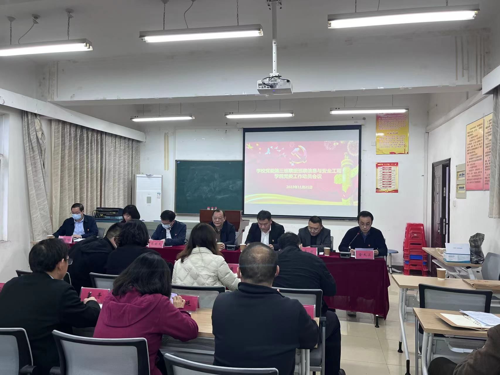 (通讯员 杨晨)根据校党委统一部署与第四届党委第五批巡察工作安排,2022年11月21日下午16:00,第三巡察组巡察信息与安全工程学院党委动员会在文永楼502会议室召开。学校党委第三巡察组组长祝振炎,学校纪委副书记、党委巡察办公室主任张文剑,党委巡察办公室副主任潘丰文,党委第三巡察组副组长于方、范献龙,党委巡察办公室秘书刘一民,党委巡察组成员高梦娇、杨曼、田柯,学院领导班子成员,院党委委员、纪委委员,党政管理全体工作人员,实验中心工作人员及教研室主任,教工党支部书记,教师代表等参会。会议由学院院长兼党委副书记金大卫主持。