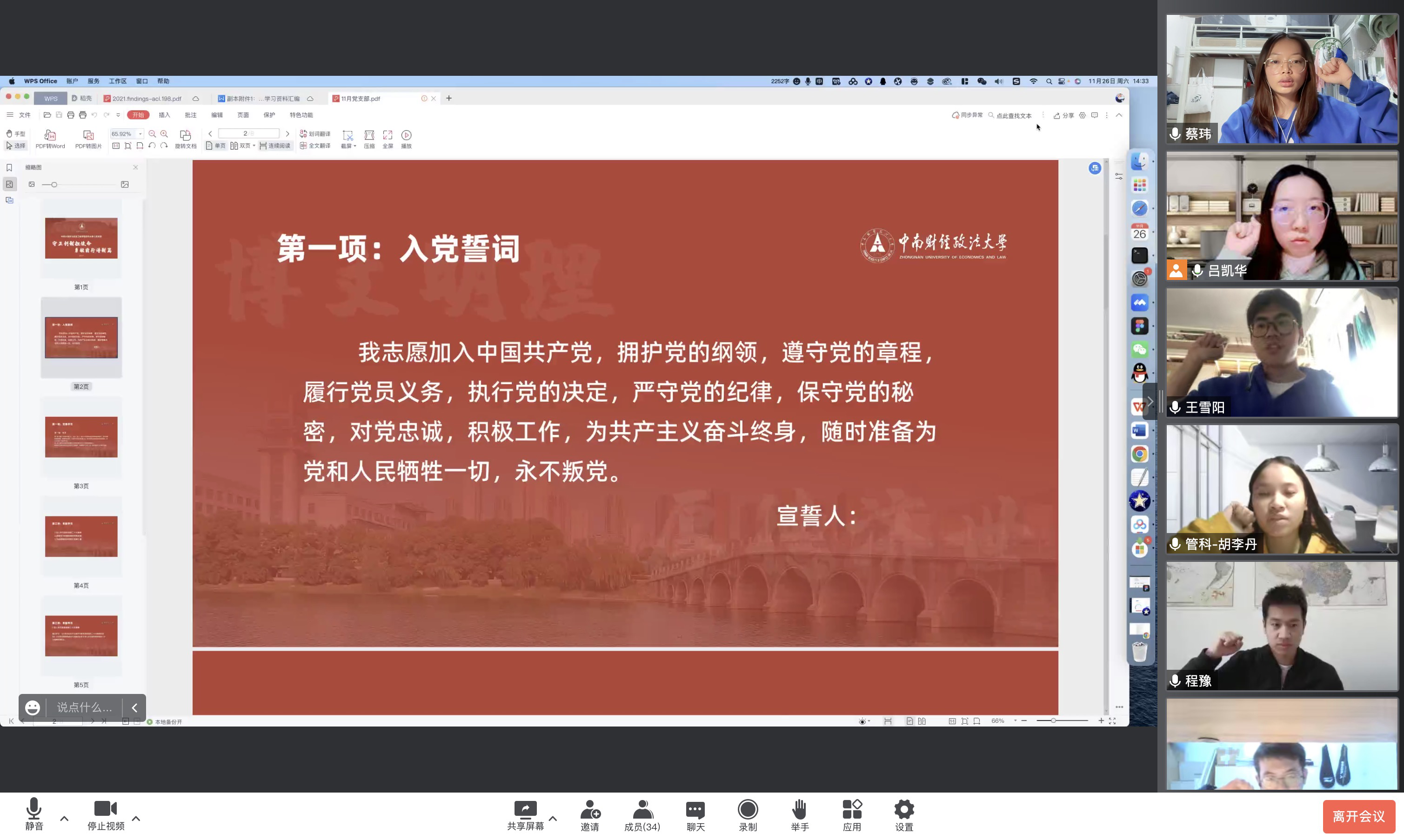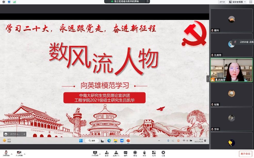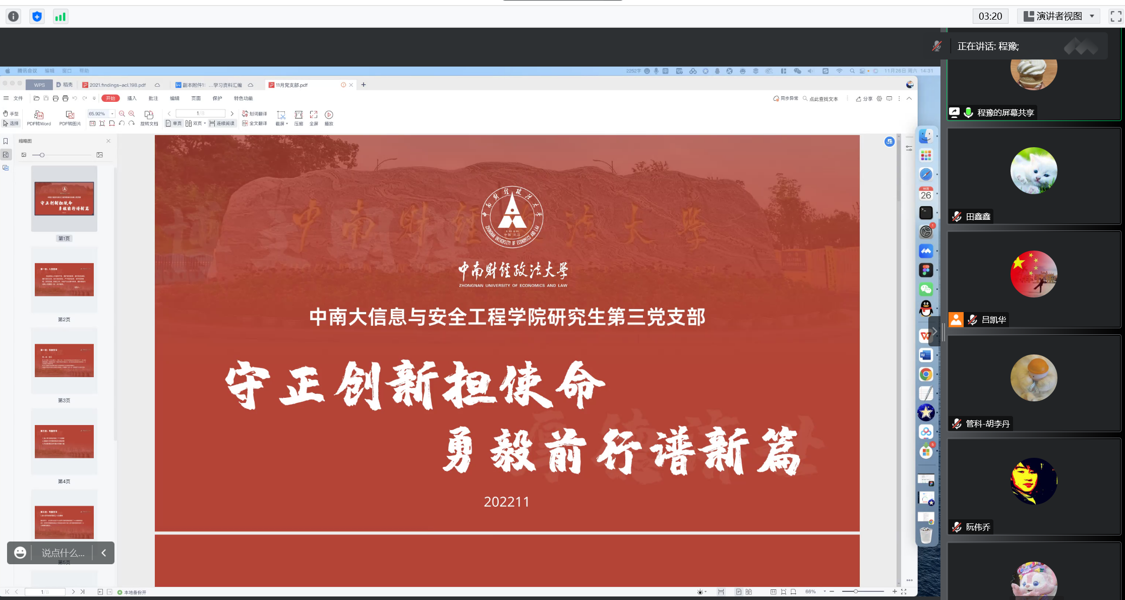 2022年11月26日星期六14:30信息与安全工程学院研究生第三党支部积极响应中南大疫情防控政策,通过腾讯会议的形式召开了以“守正创新担使命,勇毅前行谱新篇”为主题的党日活动。