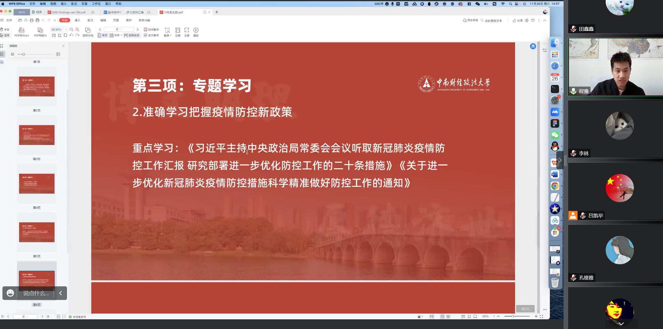 第二部分,准确学习把握疫情防控新政策,程豫同志领学《习近平主持中央政治局常委会会议听取新冠肺炎疫情防控工作汇报研究部署进一步优化防控工作的二十条措施》《关于进一步优化新冠肺炎疫情防控措施科学精准做好防控工作的通知》文件。全体党员通过学习,充分认识抗疫斗争的复杂性、艰巨性、反复性,提高政治站位,全面贯彻落实党中央决策部署,积极响应配合防控策略和方针,以实际行动贯彻落实党的二十大精神。
