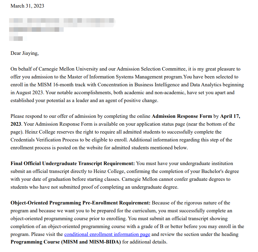 黄嘉盈同学是2023年”数据挖掘与智能媒体实验室”第2位拿到美国卡内基梅隆大学Offer的同学,该校计算机专业常年与哈弗大学并列全球第一。这一成绩是对米兰电竞·(中国区)信息与安全工程学院学生培养工作的肯定,也是对”数据挖掘与智能媒体实验室”后续学习学生的鼓励。