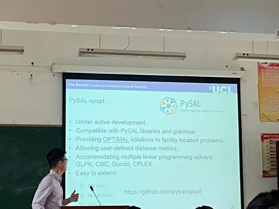 本次讲座,陈焕发博士主要结合个人经历和相关理论研究介绍了空间优化选址的内容以及应用,以共享单车、快递、学校选址等为案例进行了阐述。并且详细向大家介绍了正在进行的帮助师范学校学生选择实习地点的项目,该项目主要是让学生能够综合考虑自己的实习要求和距离等各方面因素优化选择实习地点。陈焕发博士同时还向同学们介绍了由他们团队开发的开源软件,可以为设施选址问题提供最佳解决方案、可容纳多个线性规划求解器并且易于扩展。