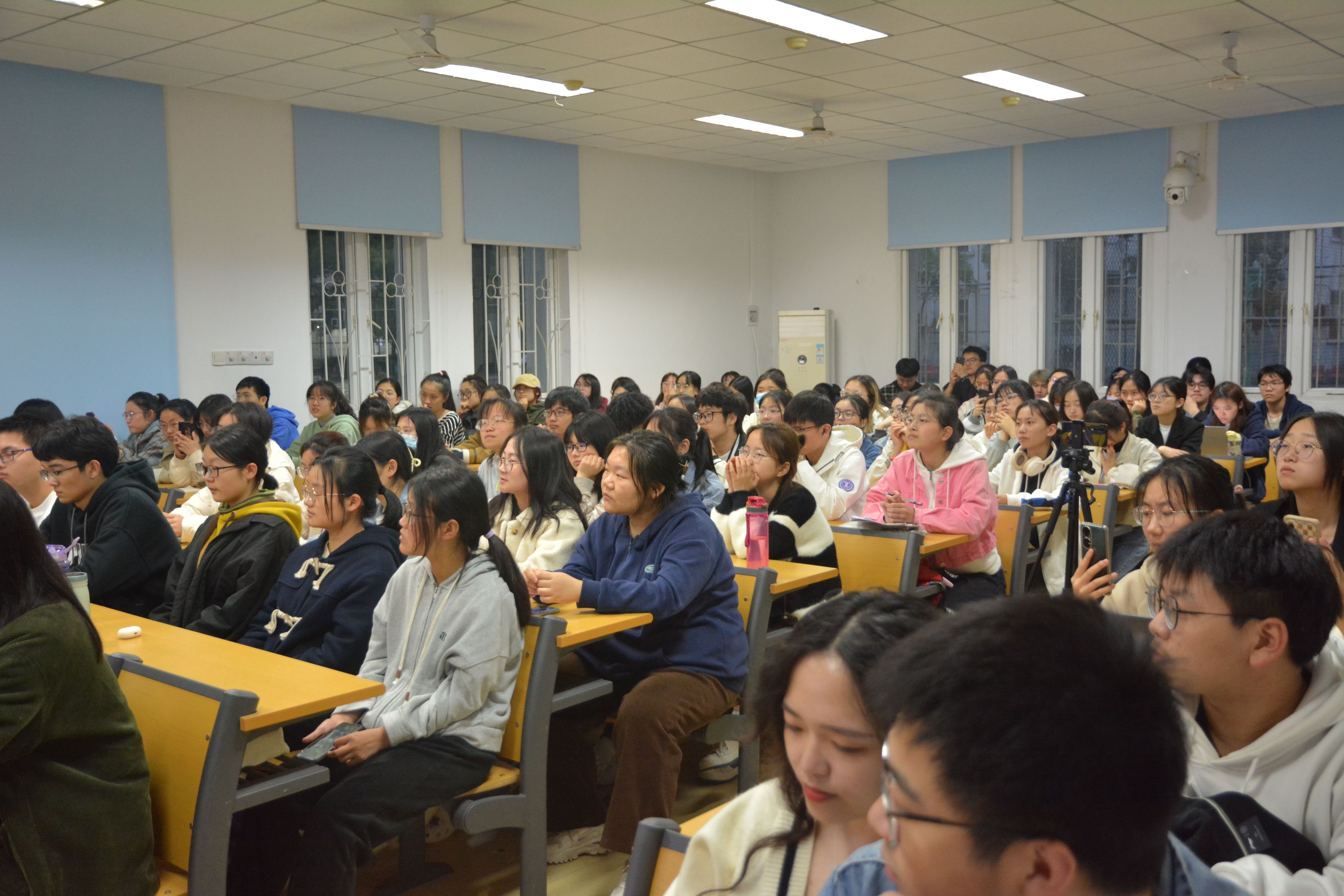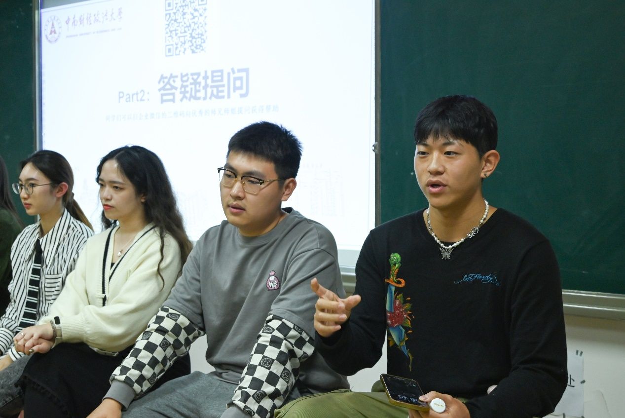 交流会开始,陈孝丁敬老师首先感谢六位毕业生回到首义校区为同学们答疑解惑、分享经验,同时也肯定了到场同学们的积极性,希望大家通过这次分享会能够了解到未来的多种可能性,并基于自己实际情况确定目标、制定规划,珍惜大学时光,努力奋斗。除此之外,陈孝丁敬老师还强调,到场的各位师兄师姐不仅是在学业上取得了不错的成绩,同时还在大学期间担任学生干部、参加各项活动、赛事,也希望大家向他们学习,不仅顾好自己的学习主业,也要积极丰富自己的课余生活,锻炼自己的综合能力。