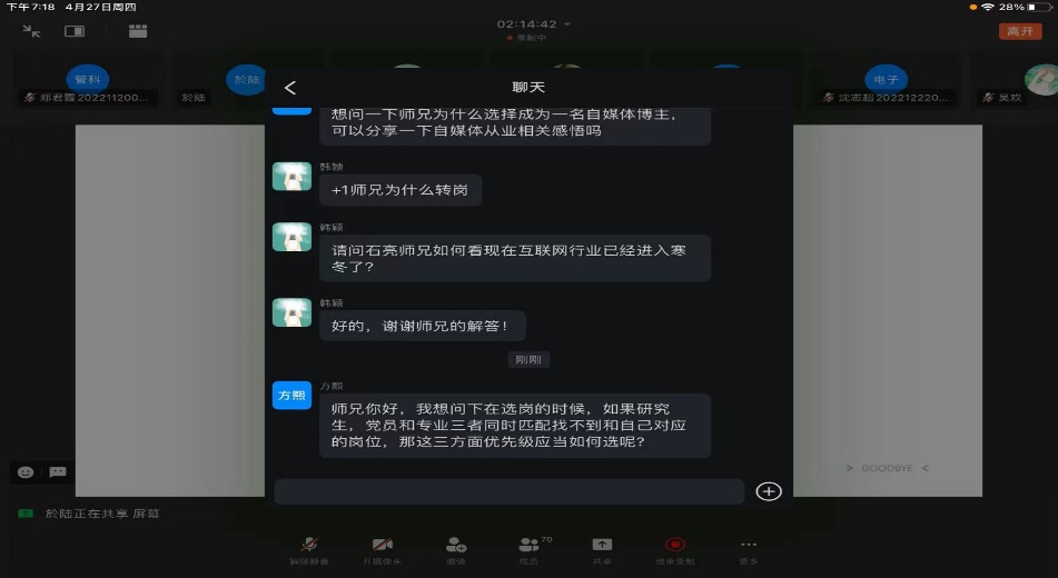 活动开始前,主持人王双萍简要介绍了本次活动的背景和流程。活动分为经验分享和观众提问两个环节。第一位分享嘉宾是金融学院金融学13级本科的石亮师兄,他先前担任美国独角兽创业公司数据分析师,字节跳动数据分析师,目前是自媒体博主,全网粉丝10w。石亮师兄主要从面试和实习经验两方面展开分享。首先为同学们介绍了在面试中应该注意的问题,主要强调了技术岗、数据岗面试前刷题应注意熟练度,不要盲目追求数量而要注意质量。其次,石亮师兄还分享了最大化实习效益的经验,鼓励同学们不要做打杂人,要在工作中主动出击,多做执行类工作。