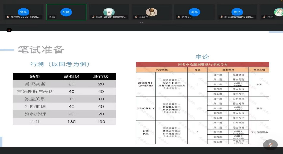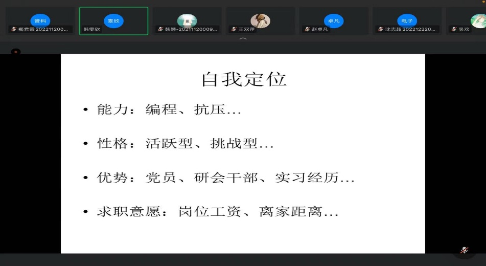 第五位分享嘉宾是2020级管理科学与工程专业(数据挖掘与商务智能方向)的韩雯欣师姐,就业方向为武汉理工大学管理岗。师姐主要从自我定位、笔试面试、岗位剖析三方面向大家介绍了高校管理岗求职过程中应该注意的地方。同时,师姐还特别强调了笔试卷面的重要性,提醒同学们要字迹要清晰,答题格式要正确。