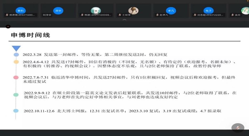 第六位分享嘉宾是2020级环境科学与工程专业的刘泽华师兄,升学读博于北京大学城市与环境学院。师兄主要分享了自己的申博经验,重点介绍了如何找到和自己研究方向契合的导师,以及如何和导师进行沟通。师兄还结合自己的科研经历鼓励同学们从身边所学发现科研乐趣,并提醒想要升学的同学们要趁早开始做准备。