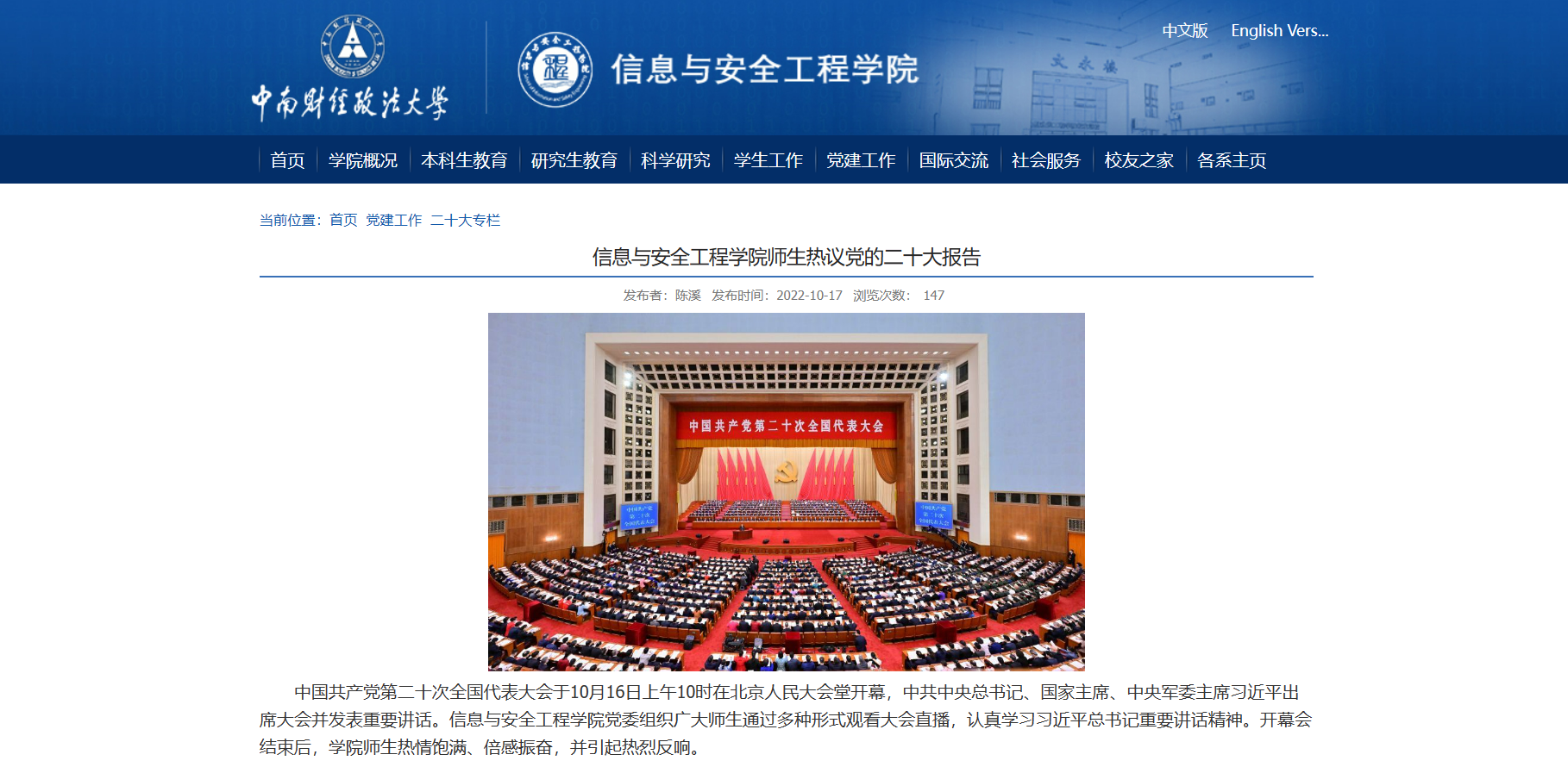 图1 信息与安全工程学院党委成员与团员代表、团学骨干共同观看二十大开幕会