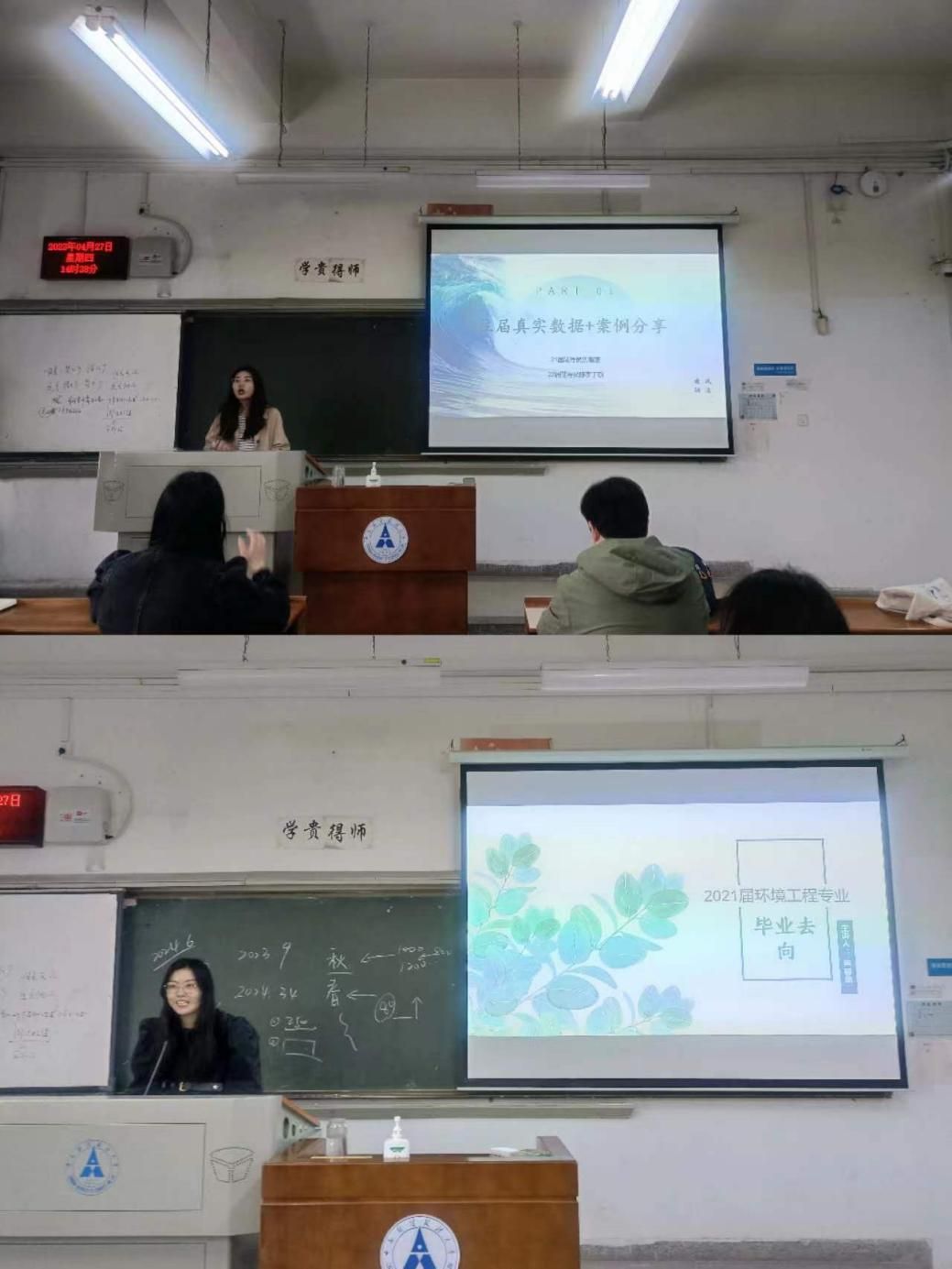 会议第一项,由焦馨蕙、陈孝丁敬老师就往届环境专业就业数据进行分析,并就往届就业真实案例进行分享。两位老师特别建议同学们在大学期间早做就业打算,积极准备,根据未来最终选择倒推眼前规划,稳打稳扎地度过大学四年。