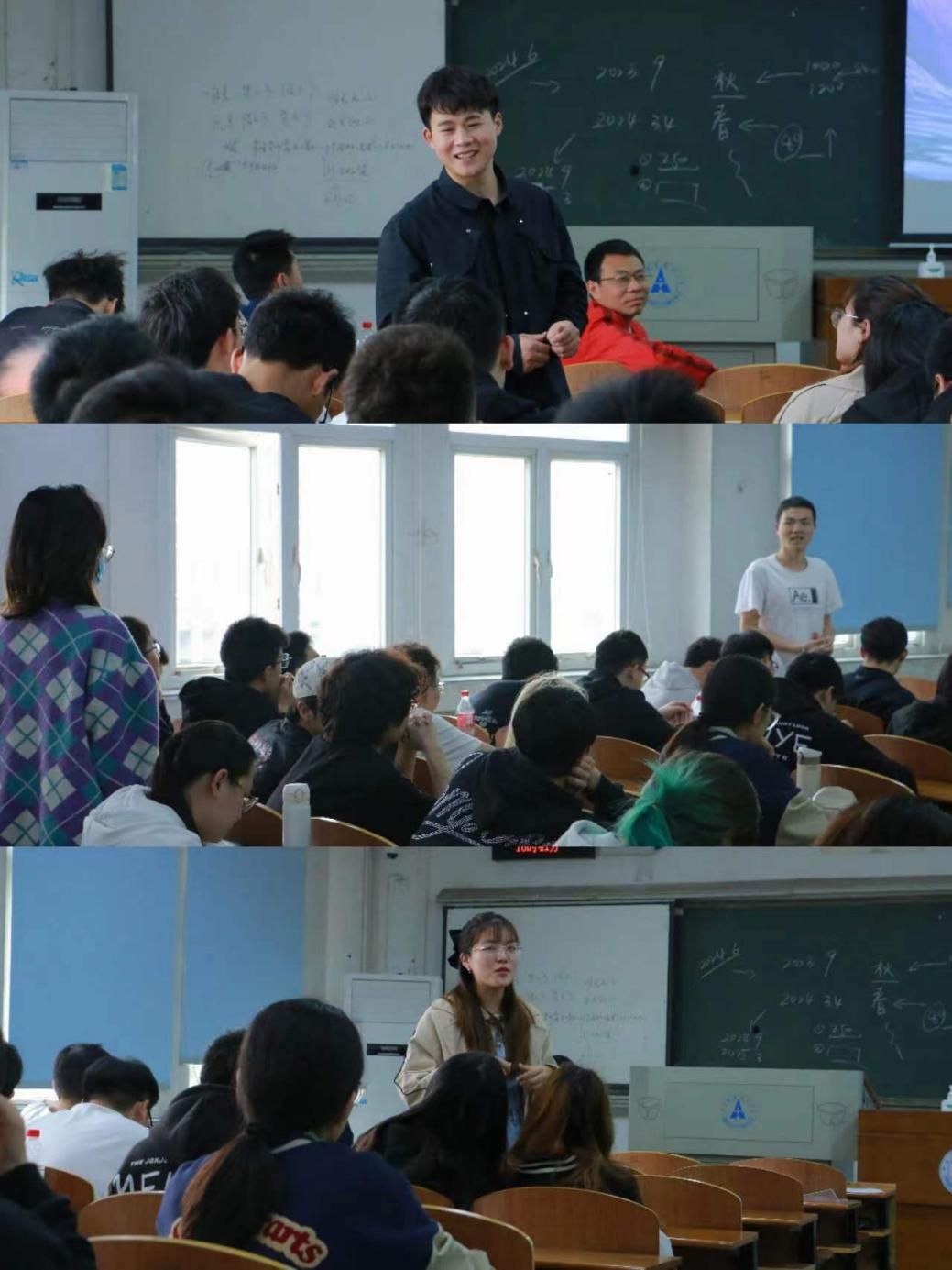 会议第三项,答疑解惑环节。同学们踊跃发言,就准备考研、就业等事项积极提问,辅导员、专任教师、优秀朋辈——研究生师兄师姐也做出了精彩的回应和解答。现场气氛热烈,同学们对就业相关规划也有了更进一步的了解。