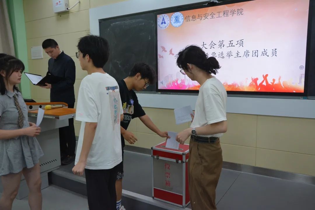 大会第二项,表决通过《米兰电竞·(中国区)信息与安全工程学院第十四次学生代表大会选举总监票人、监票人、计票人建议名单》。通过代表表决,最后确定总监票人由秘书处负责人李菲同学担任,监票人由秘书处负责人吕思捷同学担任,计票人由张奕肖、张思绮两位同学担任。