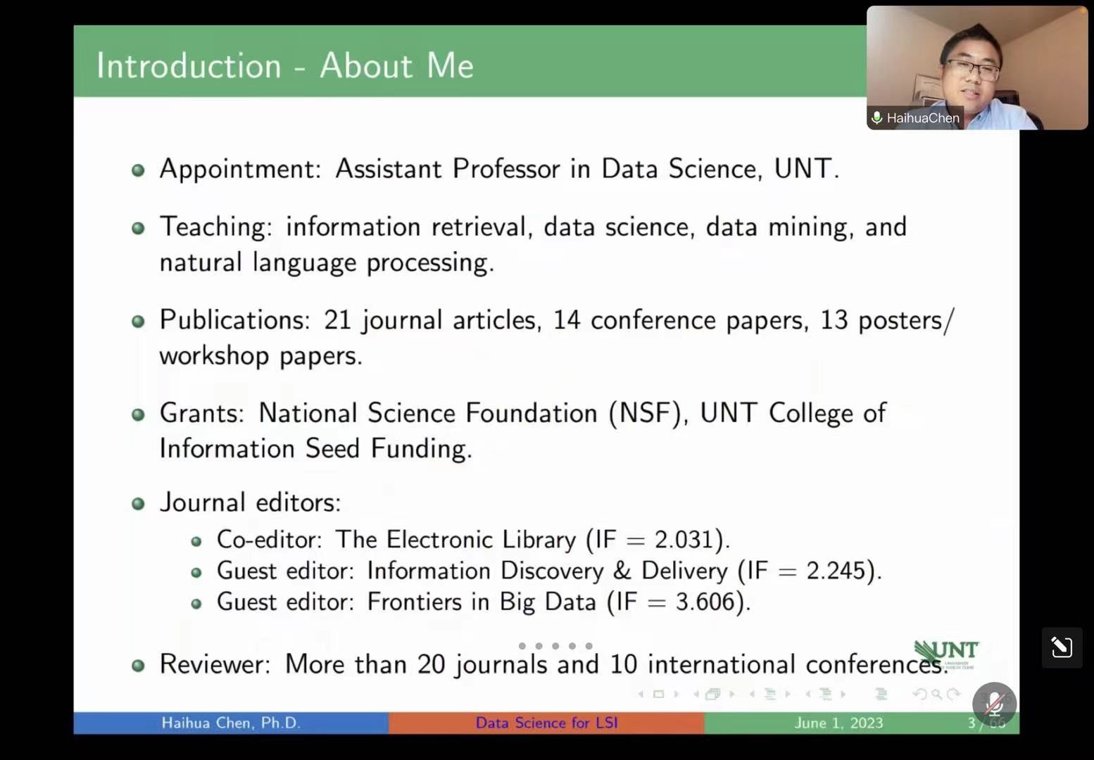 陈海华博士首先向我们介绍了他的个人信息,陈海华博士的研究方向包括文本挖掘,数据科学,数据质量,以及自然语言处理和机器学习在不同领域的应用,参与多项由美国科学基金会资助的科研项目,共发表SCI/SSCI和国际会议论文30余篇。现担任SSCI期刊 The Electronic Library的共同编辑,Information Discovery & Delivery和Frontiers in Big Data的客座编辑,是二十多种SCI/SSCI学术期刊的审稿专家,JCDL, ASIS&T, ISKO, IEEE COMPSAC, IEEE ICSC, IEEE Big Data等十余个重要国际学术会议的领域主席或程序委员会成员。