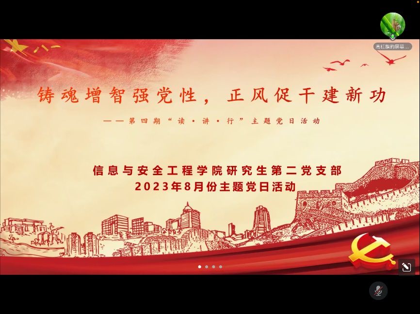 2023年8月6日晚上8:00,信息与安全工程学院研究生第二党支部线上召开了以“铸魂增智强党性,正风促干建新功”为主题的党日活动。