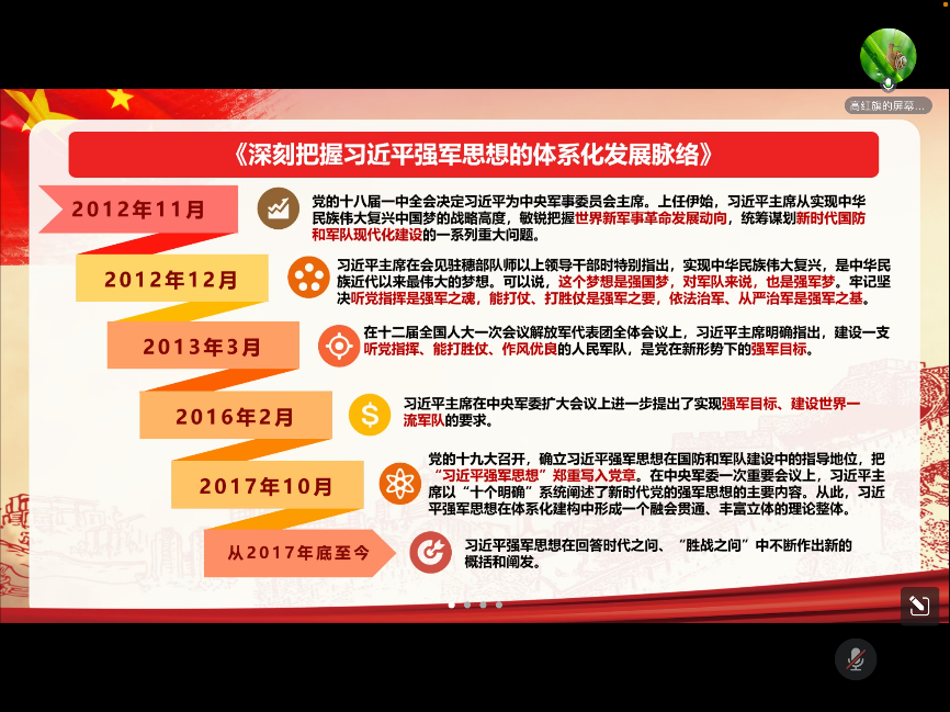 会议第三项,“讲”: 8月1日是中国人民解放军建军节,结合这一背景,支部党员在高红旗同志带领下学习《深刻把握习近平强军思想的体系化发展脉络》。习近平强军思想作为一个逻辑严密、高度概括的理论体系,是党在新时代关于强军兴军一系列思想观点的总和。其中蕴含着审视历史与现实、把握时代与大局的主观能动精神,体现着不断进行体系性创新、创造性升华的思想理论活力。