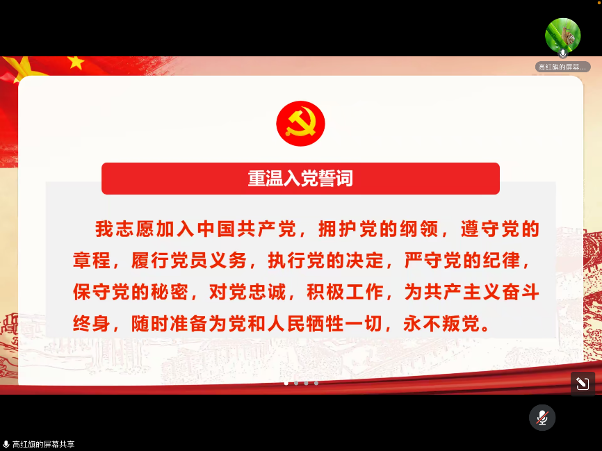 会议第一项,重温入党誓词。全体支部党员在纪检委员高红旗同志的带领下重温入党誓词。