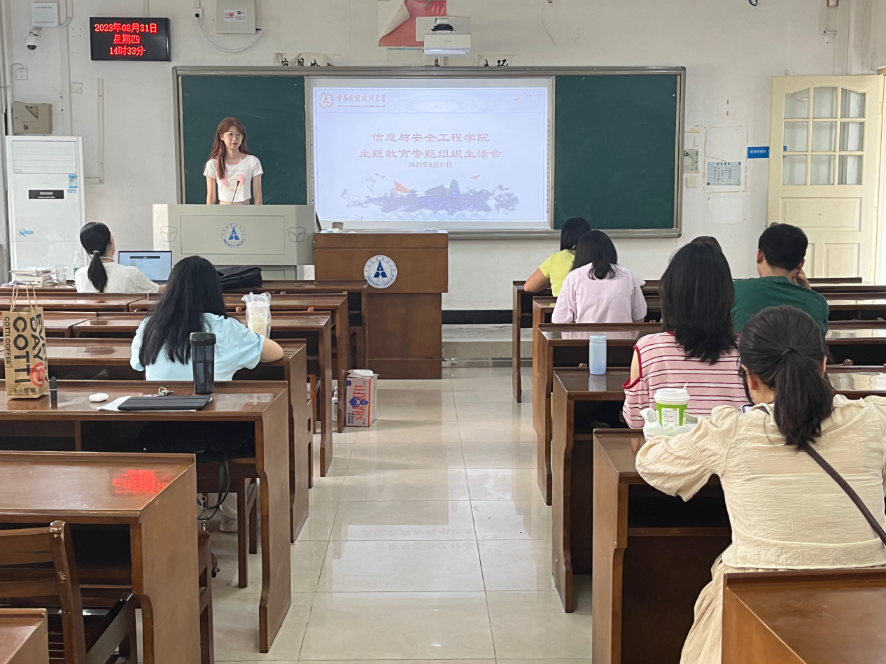 2023年8月31日下午,信息与安全工程学院本科生第七党支部在文澜102教室召开了以“学习贯彻习近平新时代中国特色社会主义思想主题教育”为专题的组织生活会。