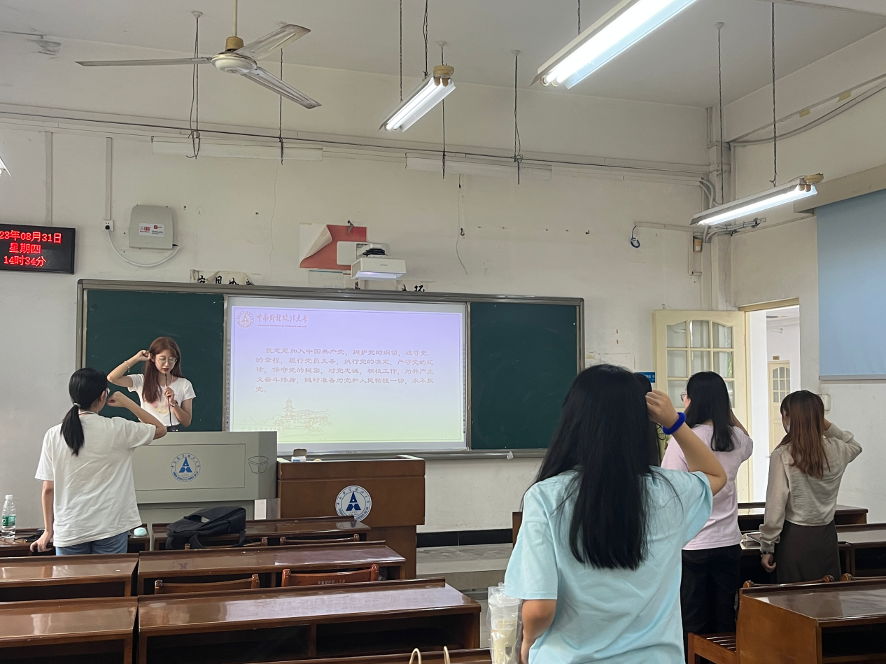 活动第一项,重温入党誓词。支部全体成员在主持人李欣瑜同志的带领下重温入党誓词。