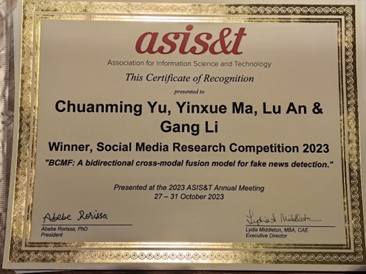 余传明教授团队撰写的论文BCMF: A bidirectional cross-modal fusion model for fake news detection获得ASIS&T社交媒体研究竞赛冠军。在会上,余传明教授与国内外参会者就论文的相关问题进行了深入交流。