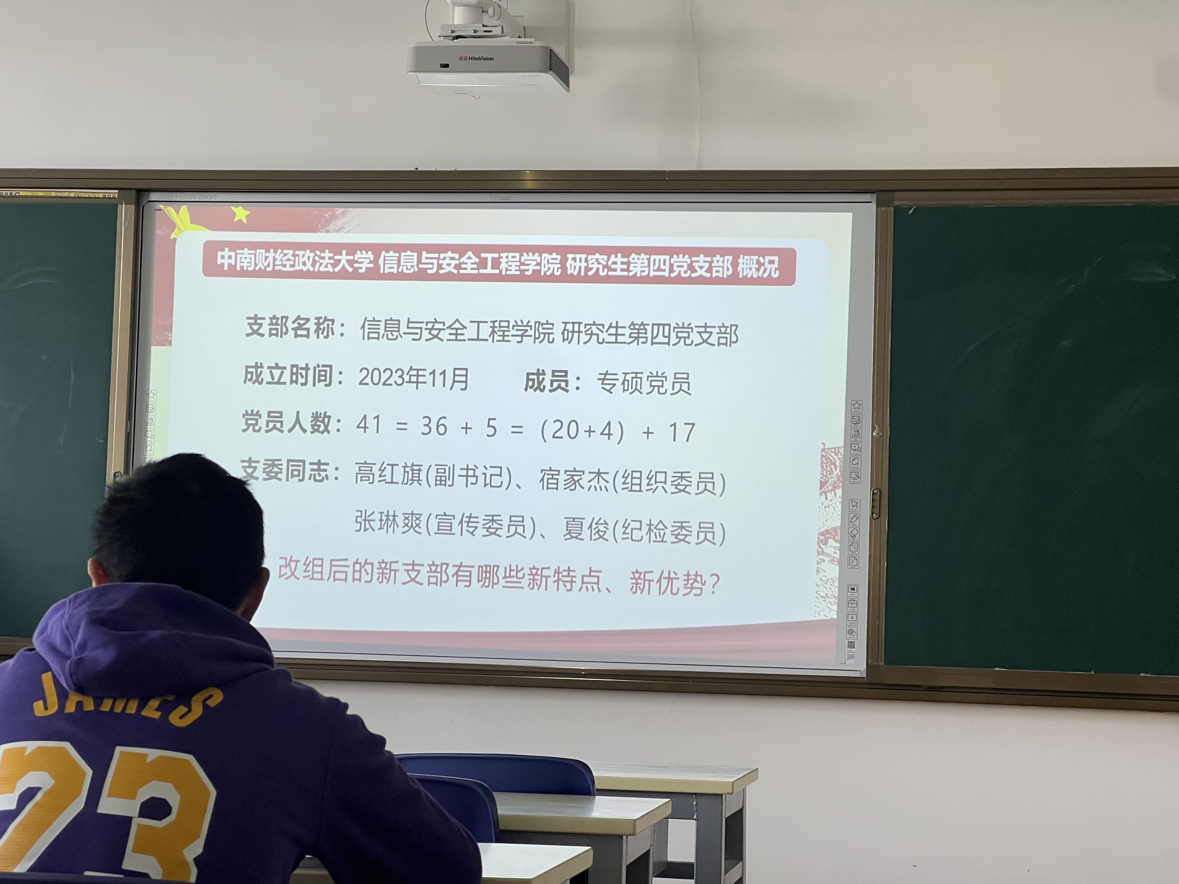 为巩固深化主题教育成果,贯彻落实巡视整改要求,信息与安全工程学院研究生第四党支部于2023年11月25日上午10:30在文澴楼517教室召开了11月主题党日活动。