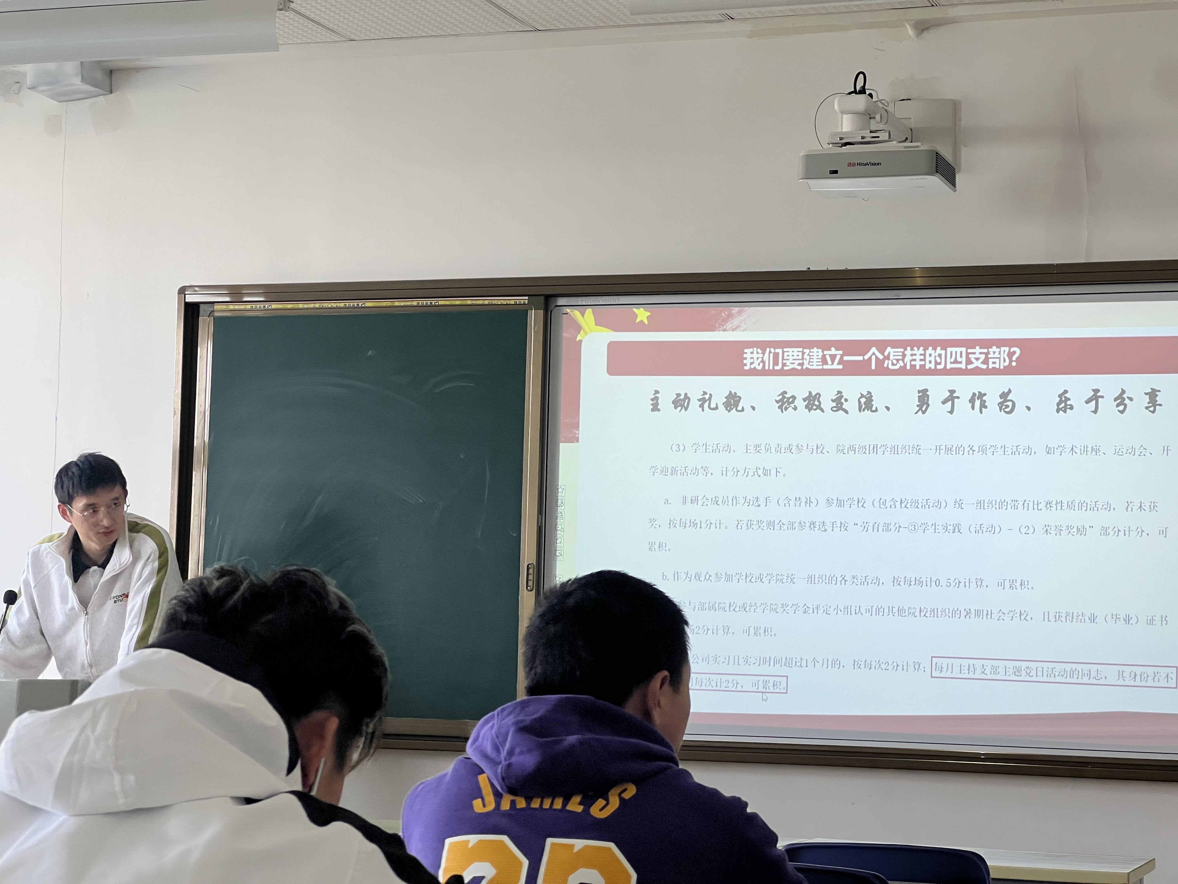 会议第二项:信息与安全工程学院研究生第四党支部成立第一课。在党支部副书记高红旗的带领之下,宣布了第四党支部的概况,各位党员同志务必注意的事项,支委构成,以及改组后的新支部有哪些新特点,新优势。我们要建立一个主动礼貌、积极交流、勇于作为、乐于分享的支部。