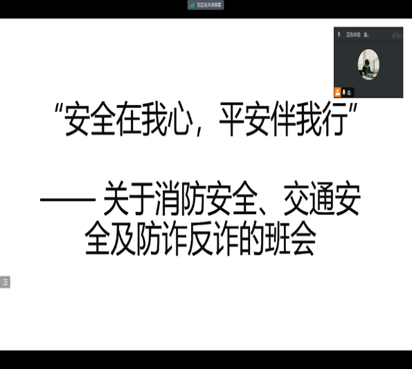 此次主题班会主要围绕消防安全、交通安全和防诈反诈等重要安全主题,各班同学在班长的带领下对各个安全议题进行深入的讨论,每位同学都对安全知识有了进一步的认识,丰富了各位同学的安全知识,提升了同学们的安全意识和自我保护的能力。