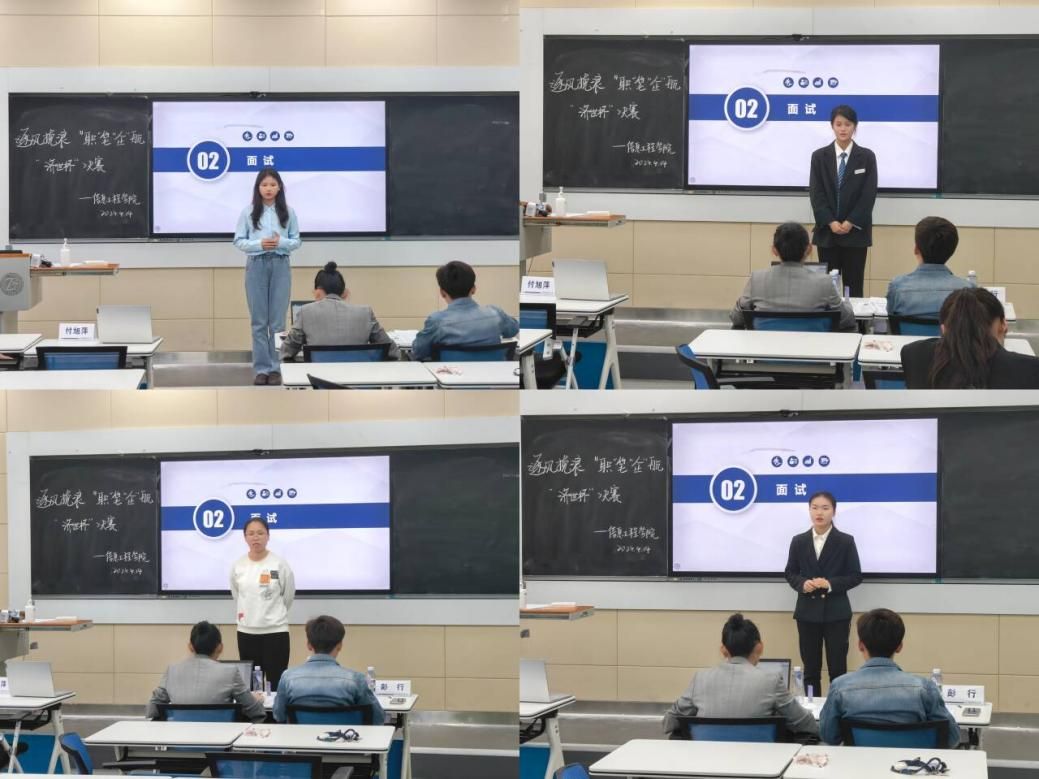 参赛同学经过简历制作与笔试两轮筛选后,最终10位同学顺利进入决赛。挑战赛决赛于4月14日在文波楼举行,平安人寿科技中心校招负责人付旭萍、上海汉得智协供应链事业部集中交付中心高级经理刘庆、信息工程学院2020级辅导员彭行担任本次决赛评委,对同学们进行现场面试、打分、指导。