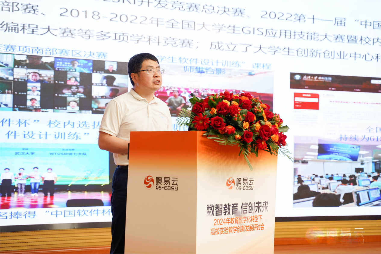 在随后的研讨会交流环节,武汉大学遥感信息工程学院副院长胡庆武做了题为“遥感信息工程拔尖创新人才数智实践平台建设”的报告。分享了武汉大学遥感信息工程实验教学中心作为国家级实验教学示范中心,在教学与人才培养实践、教学团队建设,数智创新实践教学平台建设,数智教育拔尖人才培养成效等多方面典型经验,为其他院校数字化转型提供参考和广阔发展思路。